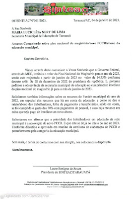 A Diretoria do Sinteac de Tarauacá, já prevendo o inicio do ano de 2023, e em virtude do anuncio do novo piso nacional da educação pelo Governo Federal, o sinteac se antecipou em enviar a Secretaria Municipal de Educação, documento OF/SINTEAC/Nº001/2023. de 04 de janeiro de 2023. requisitando o cumprimento da Lei do Piso que reajustou em 14.95%. e ainda requisitou informações sobre o pagamento do abono de 2022 e informações sobre a aprovação do novo PCCR.