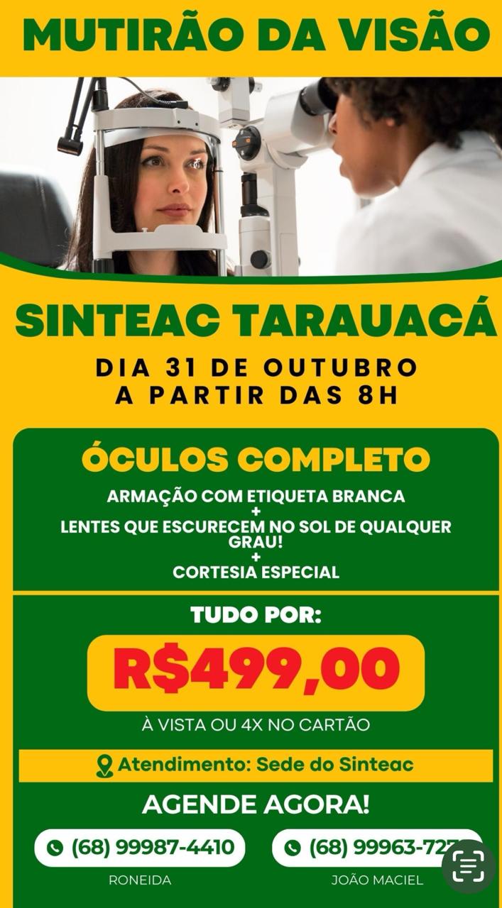 A ÓTICA SERRA DO MOA estará realizando mais um atendimento de oftalmologista, aos associados e dependentes do Sinteac de Tarauacá, será nesta quinta-feira (31/10/2024) a partir das 8h, na sede do Sinteac.