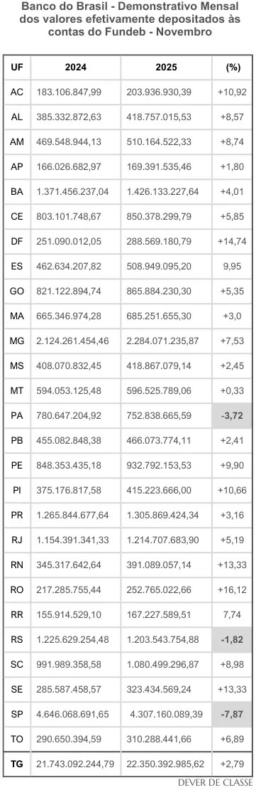>> Por Redação / O Banco do Brasil divulgou, na manhã desta terça-feira (3), o Demonstrativo Mensal dos valores efetivamente depositados às contas do Fundeb no mês de novembro. Números revelam novamente alta de recursos, fenômeno recorrente desde 2023. Nem o famoso tarifaço do Donald Trump fez o fundo despencar, tal como alguns analistas econômicos previram. Dos 27 entes, apenas três não registraram crescimento. Na comparação com o mesmo período de 2024, recursos subiram até +16,12%. Mesmo os três estados que oscilaram um pouco para baixo, apresentaram recuperação em relação ao mês de outubro deste ano. (Ver tabela geral mais abaixo).